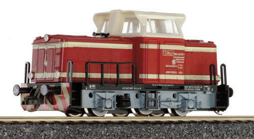 dieselová lokomotiva červená s krémovými pruhy „Chemiefasserwerk Wilhelm Pieck Schwarza“