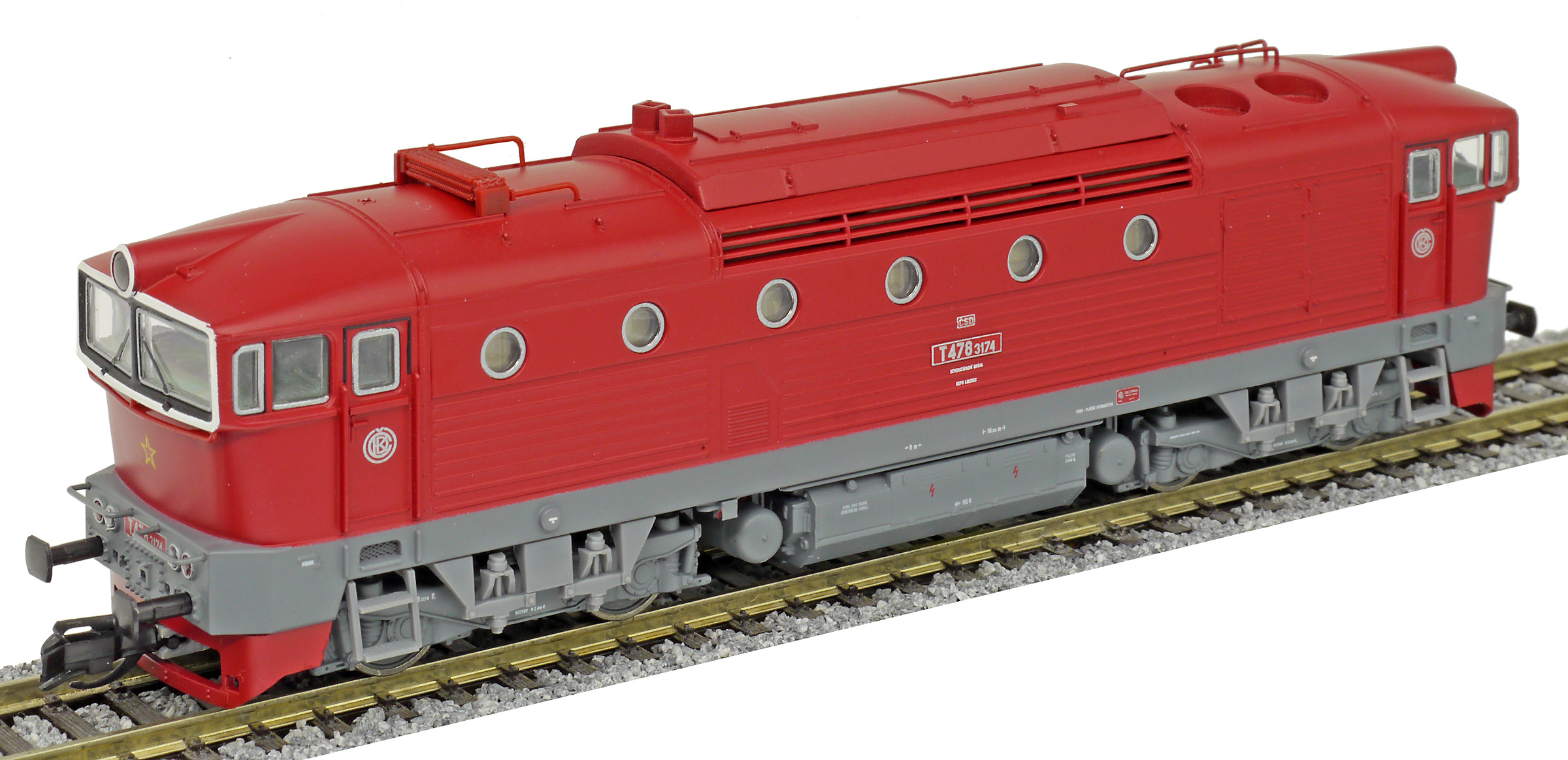 Kód   CD-754-025  [Lokomotivy] → [Motorové] → [T478.3 „Brejlovec”] → CD-754-025: dieselová lokomotiva červená s výstražným pruhem, šedé podvozky