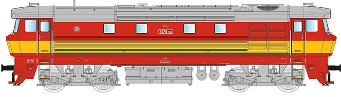| dieselová lokomotiva červená s výstražným pruhem, šedá střecha |