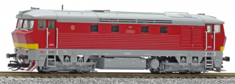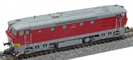| dieselová lokomotiva červená s výstražným žlutým proužkem, šedá střecha |