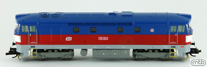 Kód   CD-749-051  [Lokomotivy] → [Motorové] → [T478.1 „Bardotka”] → CD-749-051: dieselová lokomotiva červená-modrá s bílým pásem, tmavě šedý rám a podvozky