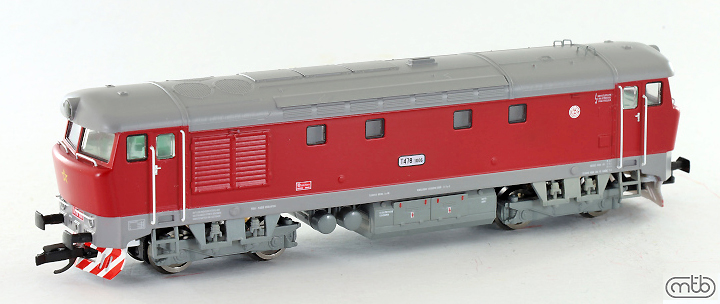 Kód   33410B  [Lokomotivy] → [Motorové] → [T478.1 „Bardotka”] → 33410B: dieselová lokomotiva červená s výstražným pruhem, šedá střecha