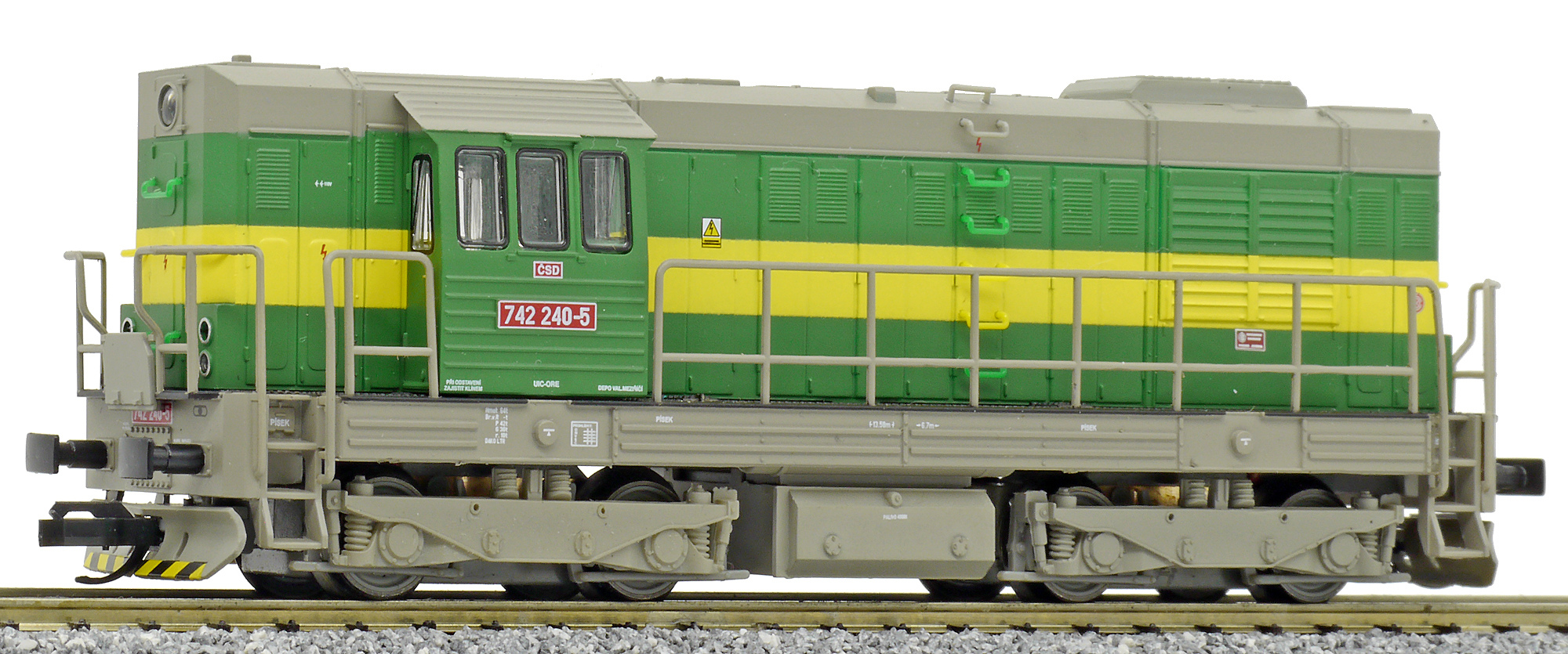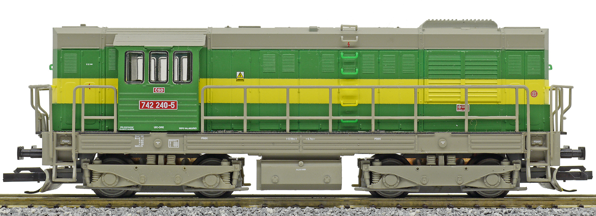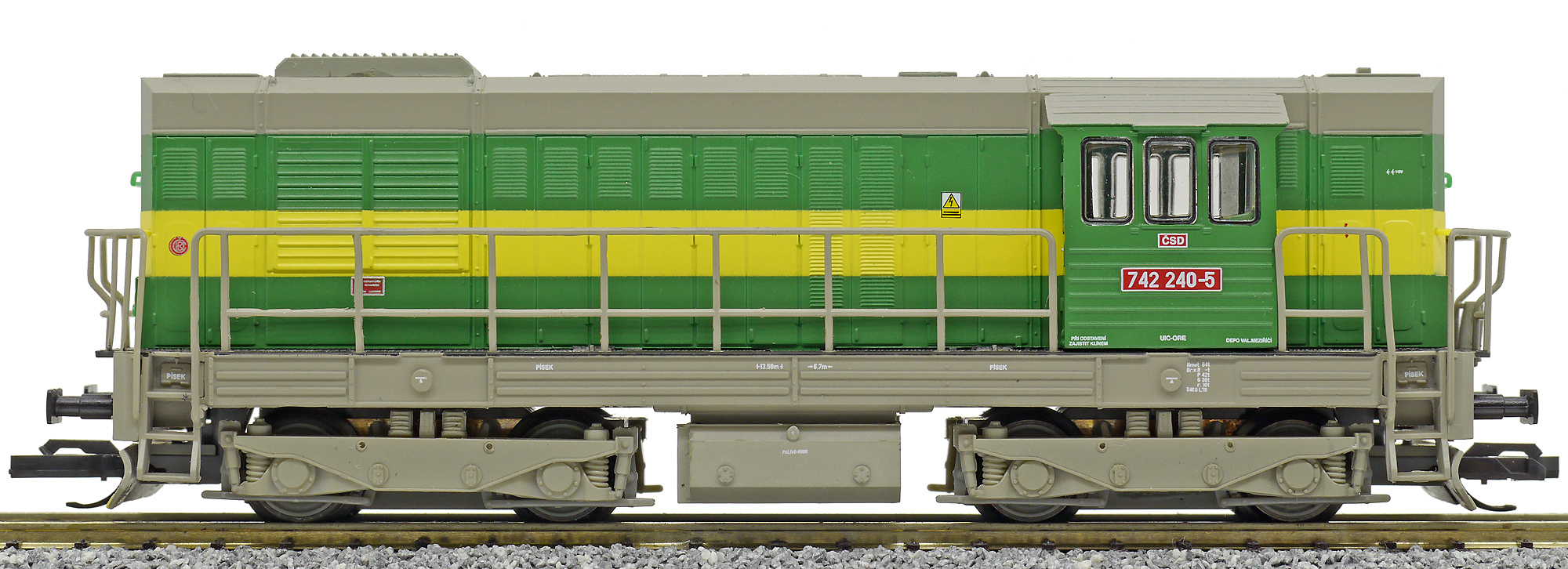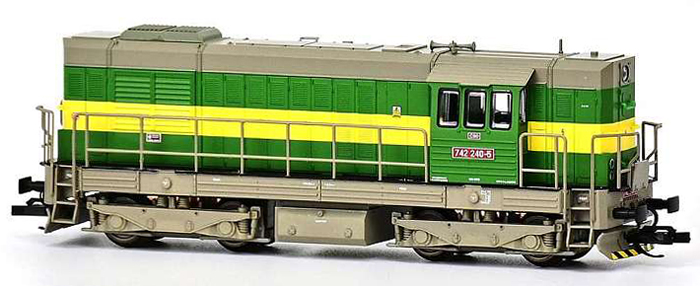 | dieselová lokomotiva v zeleném provedení se žlutým pruhem, šedá střecha, rám a pojezd |