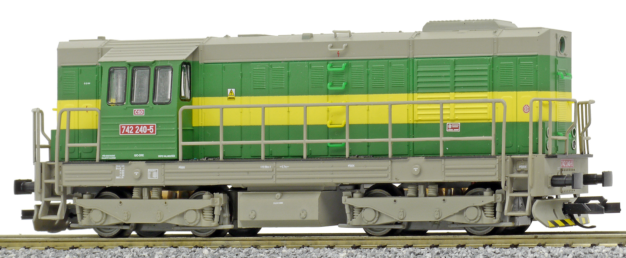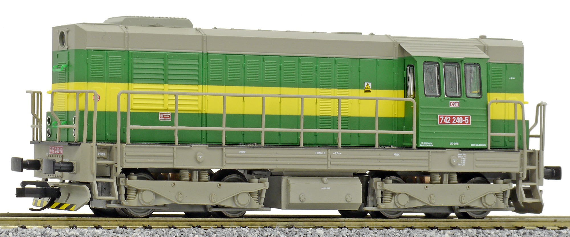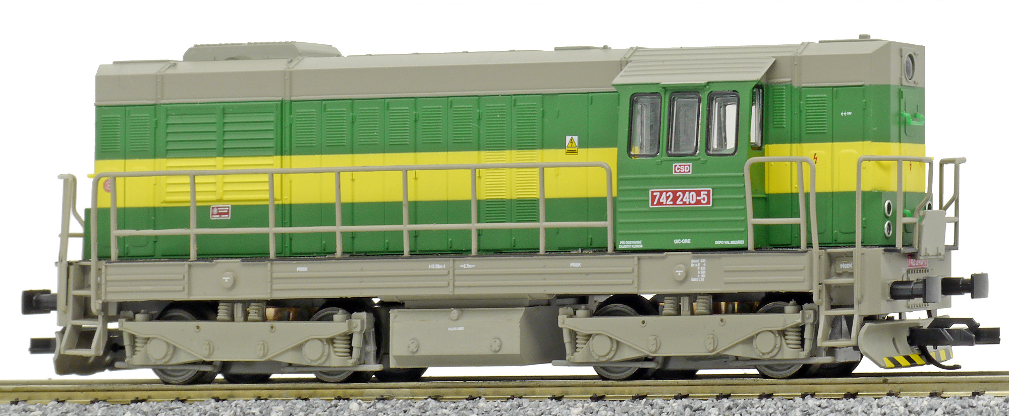 | dieselová lokomotiva v zeleném provedení se žlutým pruhem, šedá střecha, rám a pojezd |