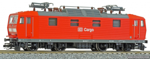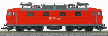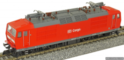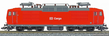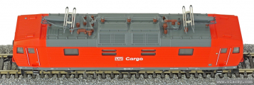 | elektrická lokomotiva červená s šedou střechou a rámem „DB Cargo“ |