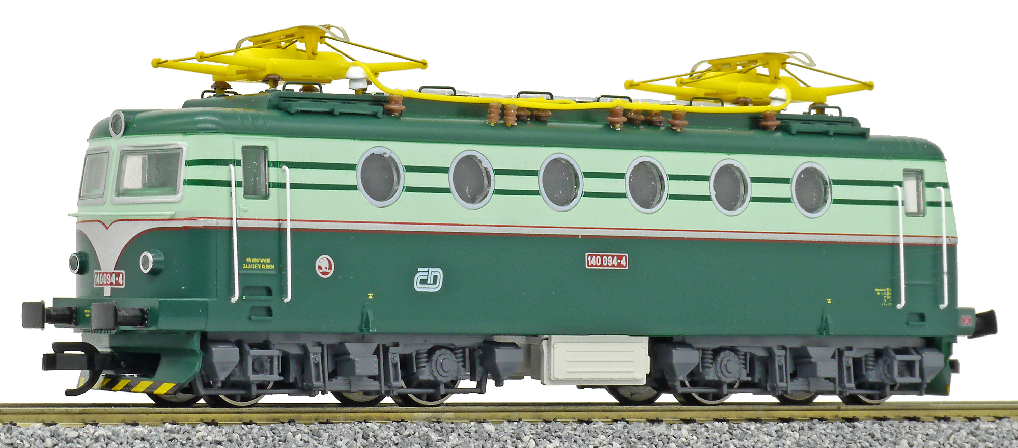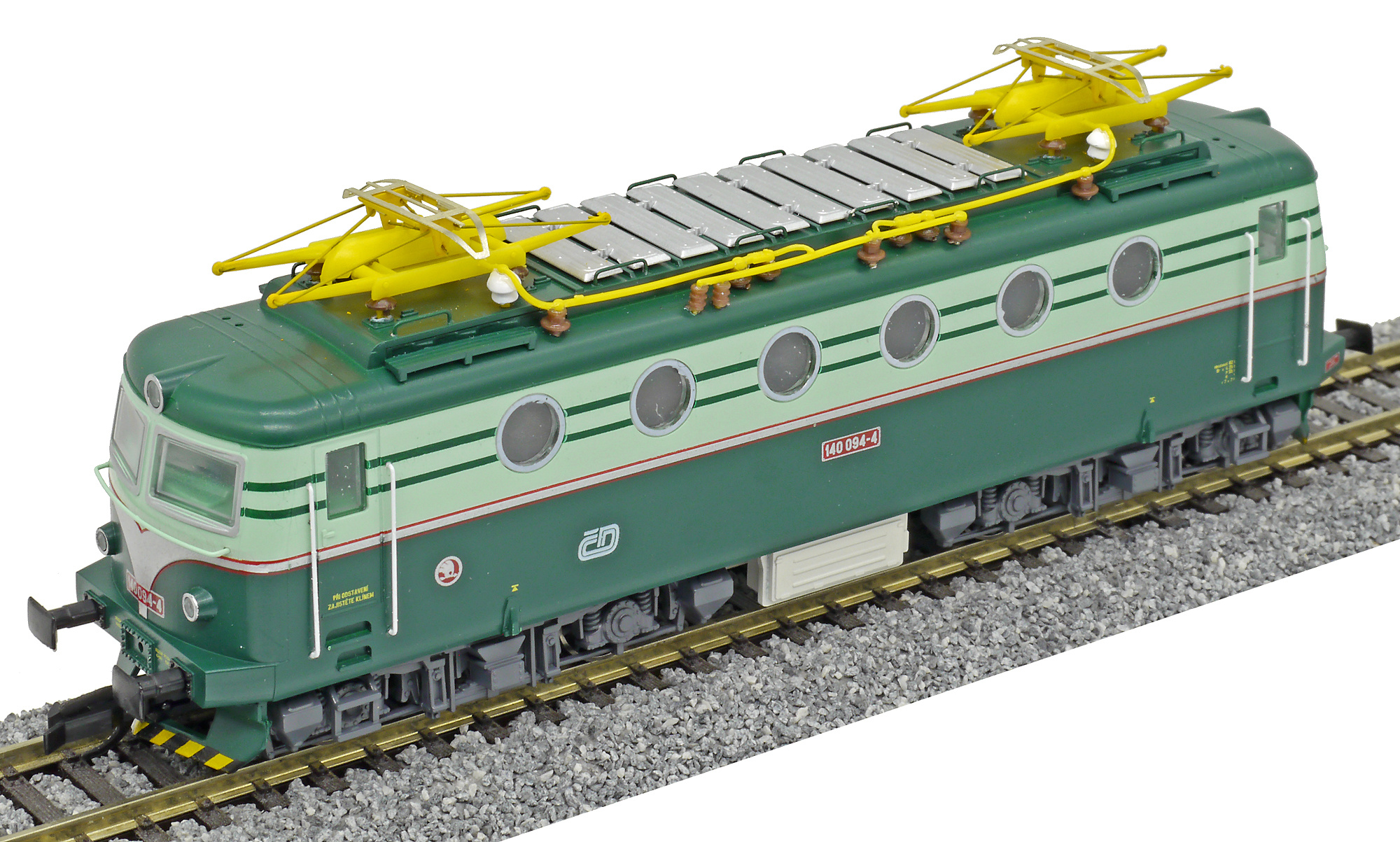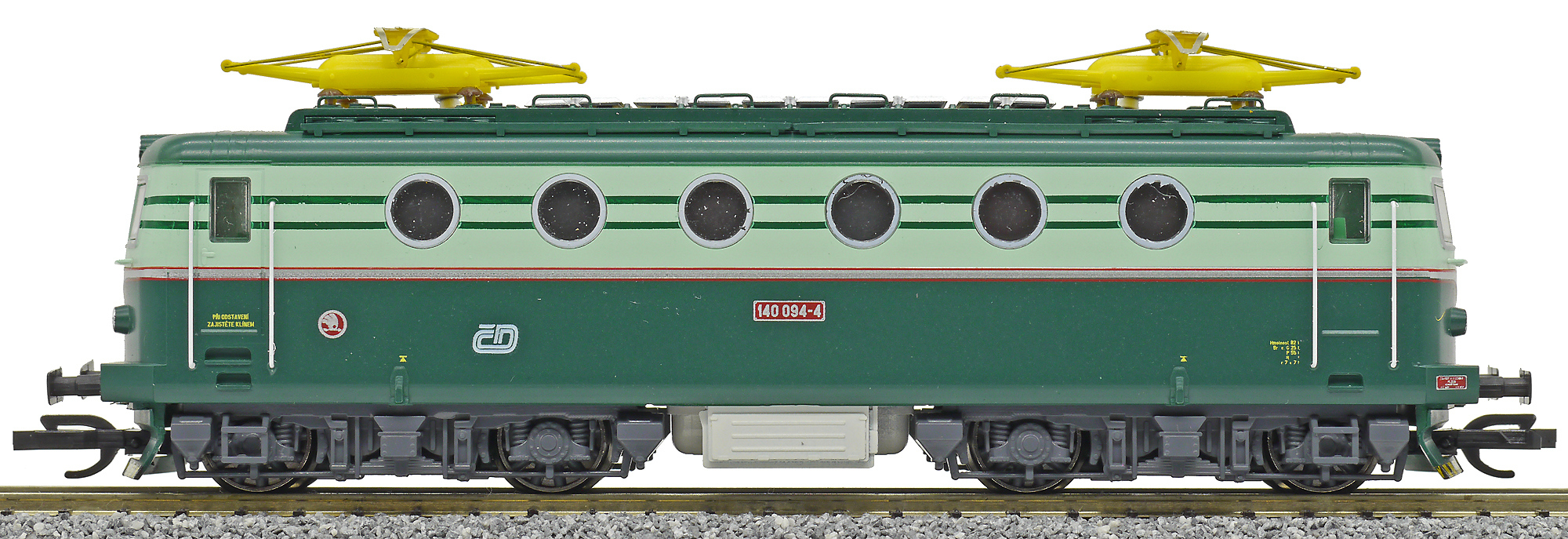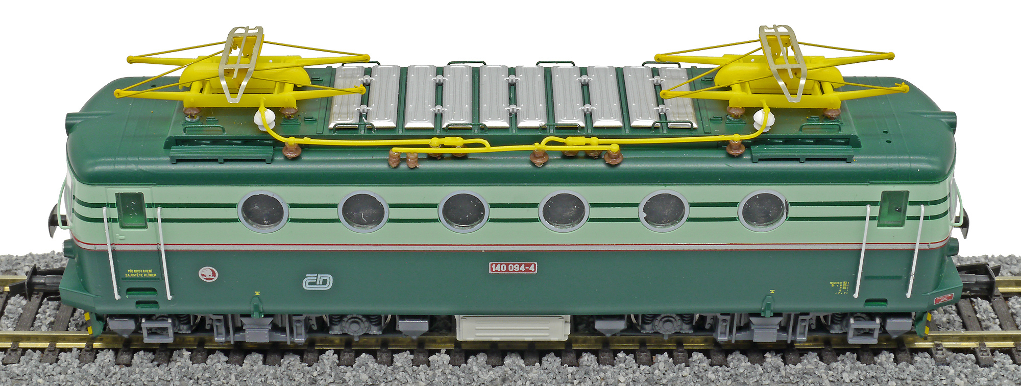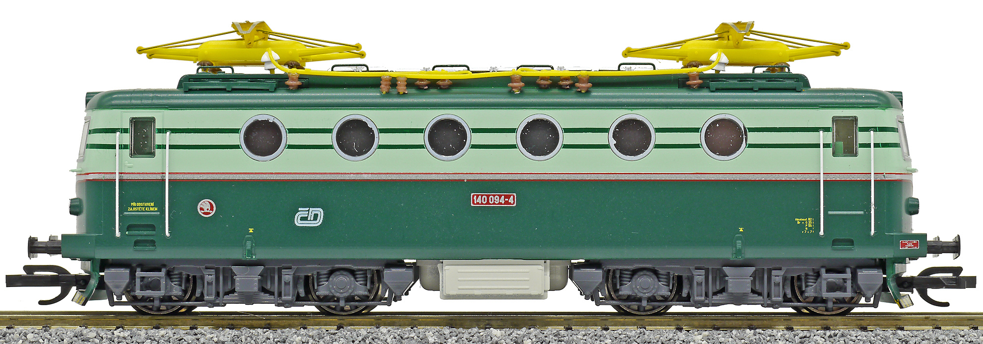 Kód   ZSR-140-065  [Lokomotivy] → [Elektrické] → [E499.0] → ZSR-140-065: elektrická lokomotiva v odstínech zelené, šedá střecha, žlutý výstražný pruh