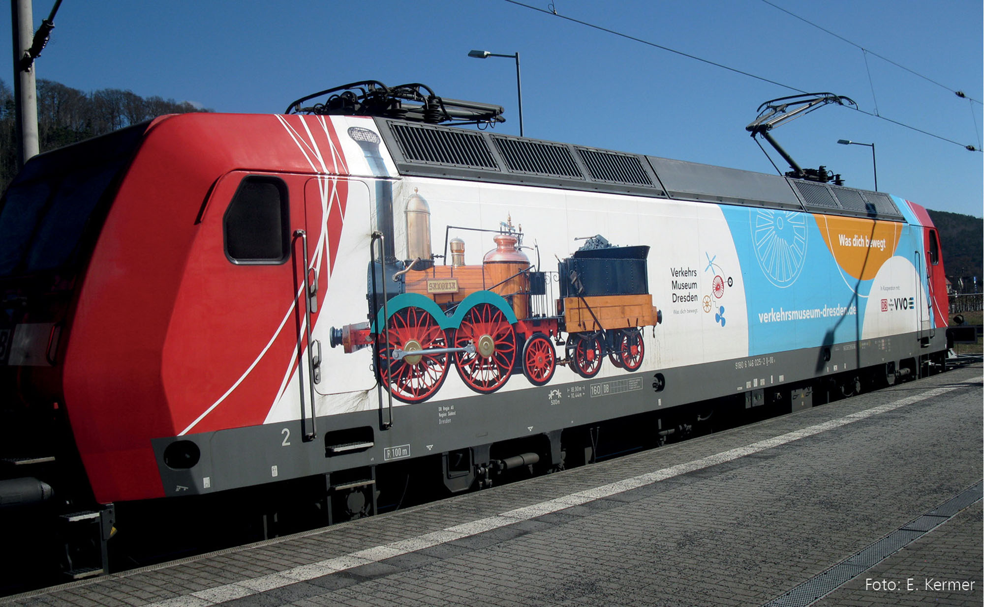 | elektrická lokomotiva s reklamním potiskem „VVO / Verkehrsmuseum Dresden“ |