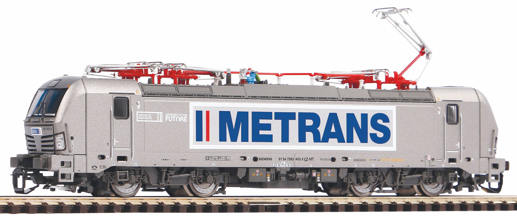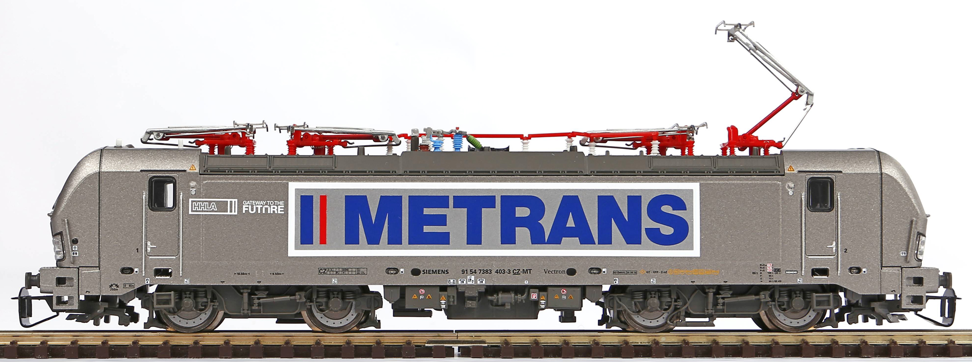 | elektrická lokomotiva stříbrná se čtyřmi polopantografy „METRANS“ |