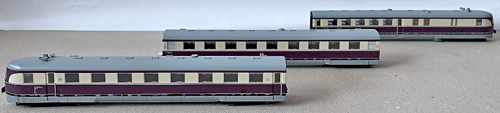| fialovo-krémová s šedou střechou a pojezdem třídílná jednotka |