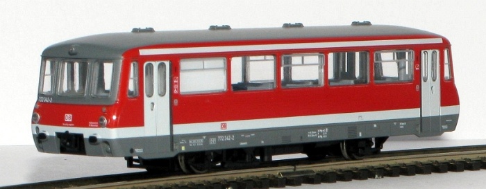 Kód   772RD  [Lokomotivy] → [Motorové vozy a jednotky] → [BR 172] → 772RD: červený s bílým pruhem a dveřmi, šedá střecha LVT 772