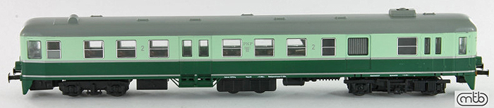 Popis   motorový vůz zelený-tyrkysový s šedou střechou, výstražný pruh na čelech