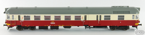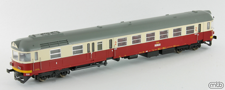 | motorový vůz červený-slonová kost s šedou střechou, výstražný pruh na čelech |