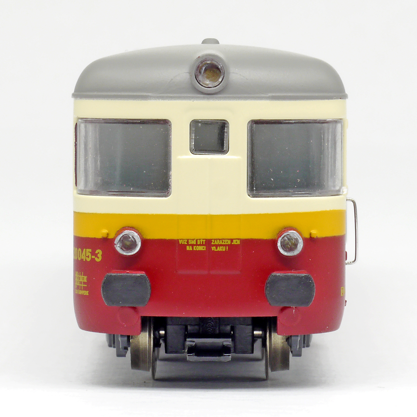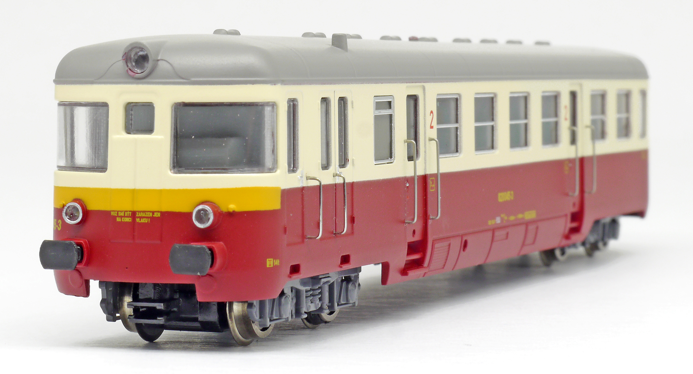 Popis   motorový vůz červený-slonová kost s šedou střechou, výstražný pruh na čelech