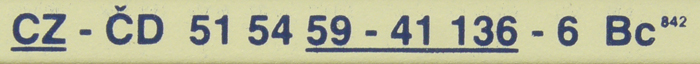 | • 51 54 59-41 136-6 | → | osobní vůz s pevným rozchodem bez klimatizace mezinárodní provoz RIC |