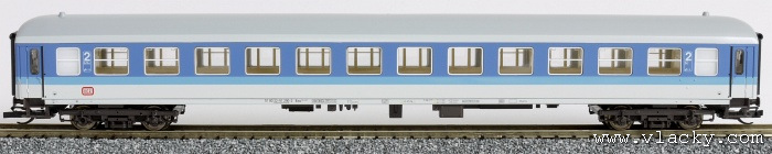 modrý-bílý se světlešedou střechou rychlíkový vůz typ m 2. tř.