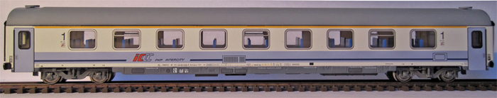 Kód   01601 E   ze SETu   [Osobní vozy] → [Rychlíkové] → [typ Eurofima] → 01601 E: rychlíkový vůz bílý s šedou střechou 1. tř. „Berlin-Warzawa-Express“