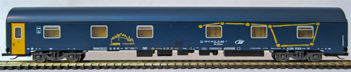 Kód   7701  [Osobní vozy] → [Rychlíkové] → [typ Eurofima] → 7701: tmavěmodrý se siluetou ″Praha″, lůžkový
