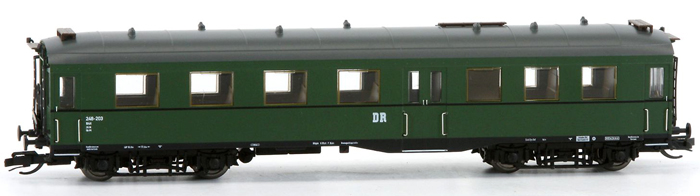 Kód   22243  [Osobní vozy] → [Spěšné a osobní] → [4-osé „Altenberg“] → 22243: osobní vůz tmavě zelený s šedou střechou 3. tř.
