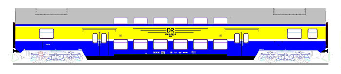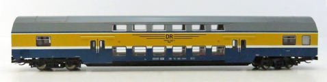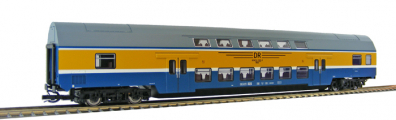 středový patrový vůz v barevné kombinaci modrá-žlutá „S-Bahn Halle-Leipzig“