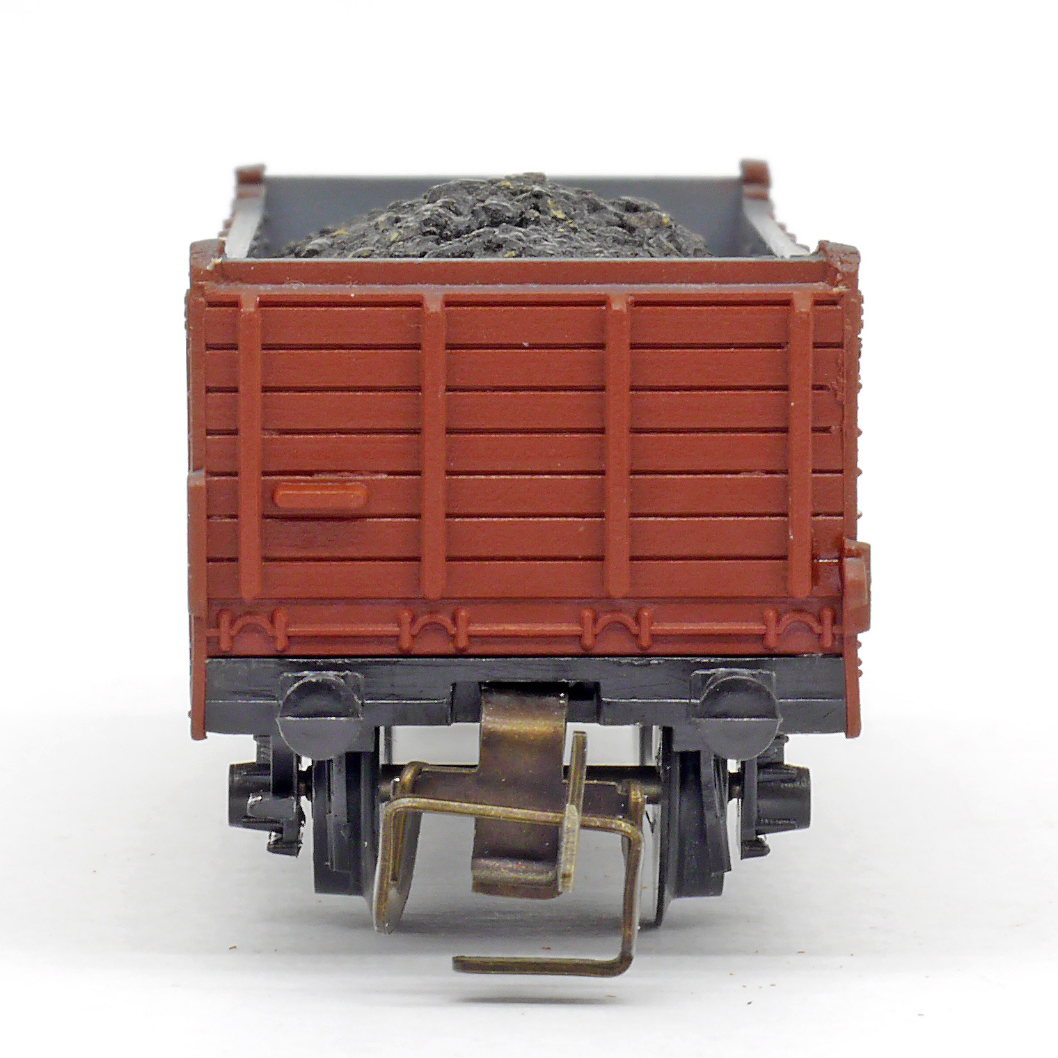 | otevřený nákladní vůz červenohnědý s nákladem uhlí |