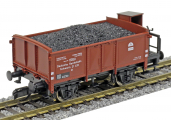 | otevřený nákladní vůz červenohnědý s brzdařskou budkou ložený uhlím |