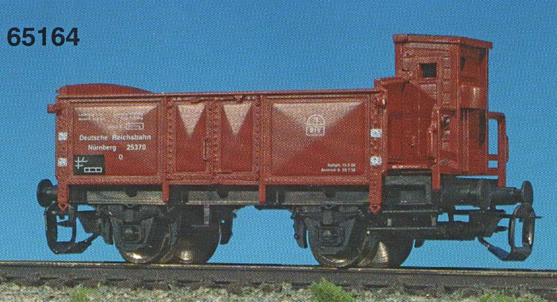 | otevřený nákladní vůz červenohnědý s černým pojezdem a s brzdařskou budkou |