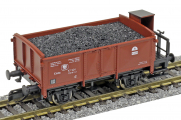 | otevřený nákladní vůz červenohnědý s brzdařskou budkou ložený uhlím |