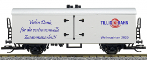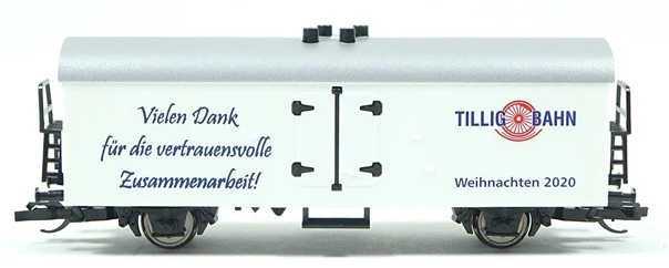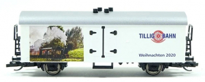 Kód   500940  [Nákladní vozy] → [Kryté] → [2-osé chladicí, pivní a reklamní] → 500940: bílý se stříbrnou střechou, vánoční Tillig 2009