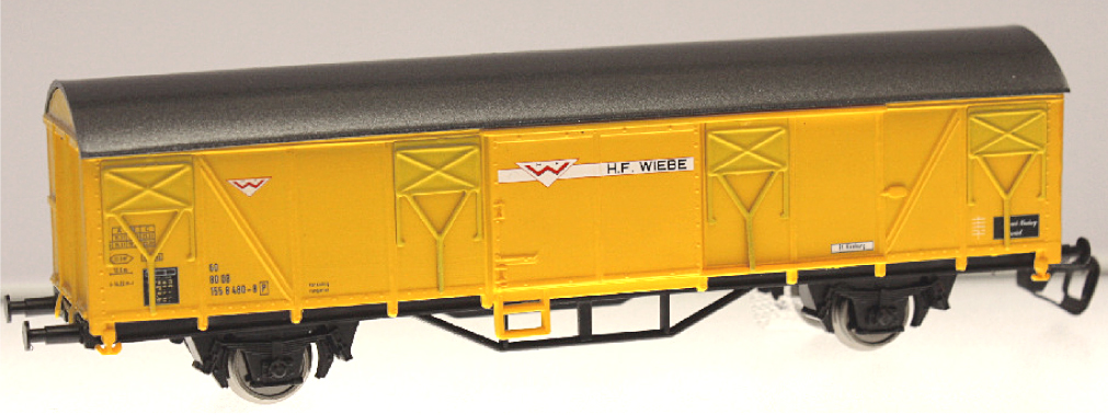 | krytý nákladní vůz žlutý se stříbrnou střechou „H.F. Wiebe“ |