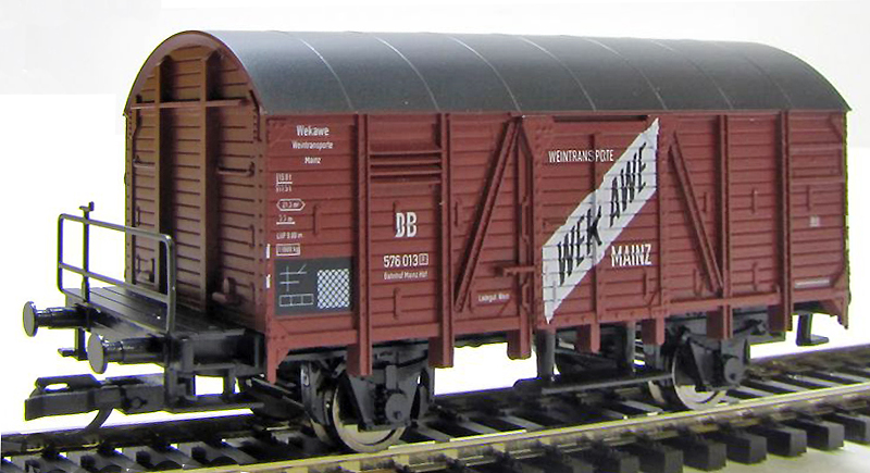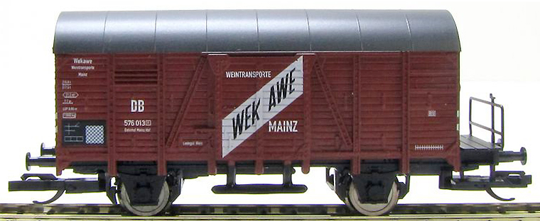 | krytý nákladní vůz červenohnědý s tmavě šedou střechou a s brzdařskou plošinou „WEK AWE“ |