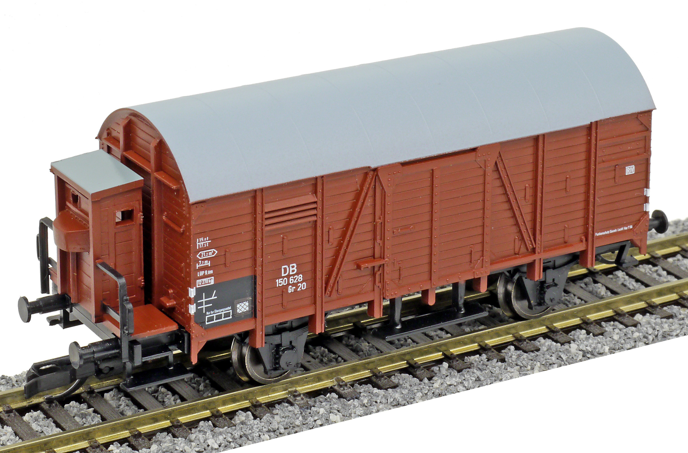 Kód   501203  [Nákladní vozy] → [Kryté] → [2-osé s vyšší střechou] → 501203: krytý nákladní vůz červenohnědý s šedou střechou a brzdařskou plošinou