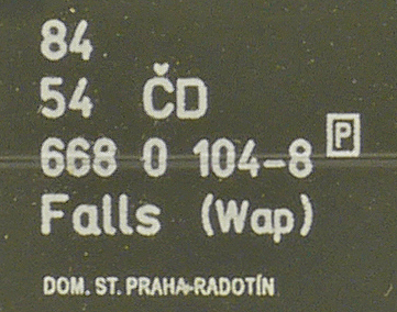 | • 84 54 668 0 104-8 | → | nákladní, s podvozky, soukromý vůz, pro vnitrostátní dopravu |