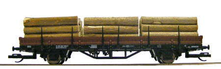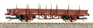 | nízkostěnný nákladní vůz červenohnědý s černým rámem a nákladem kulatiny |