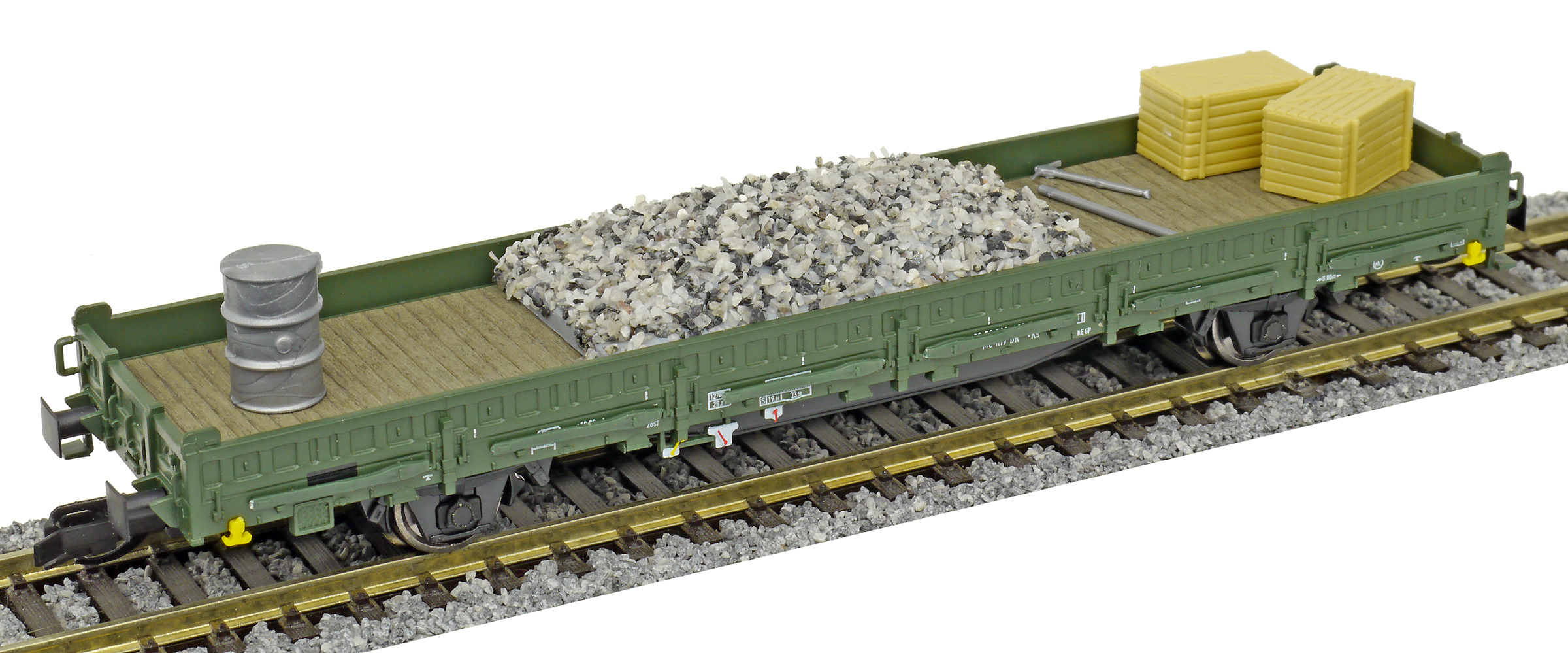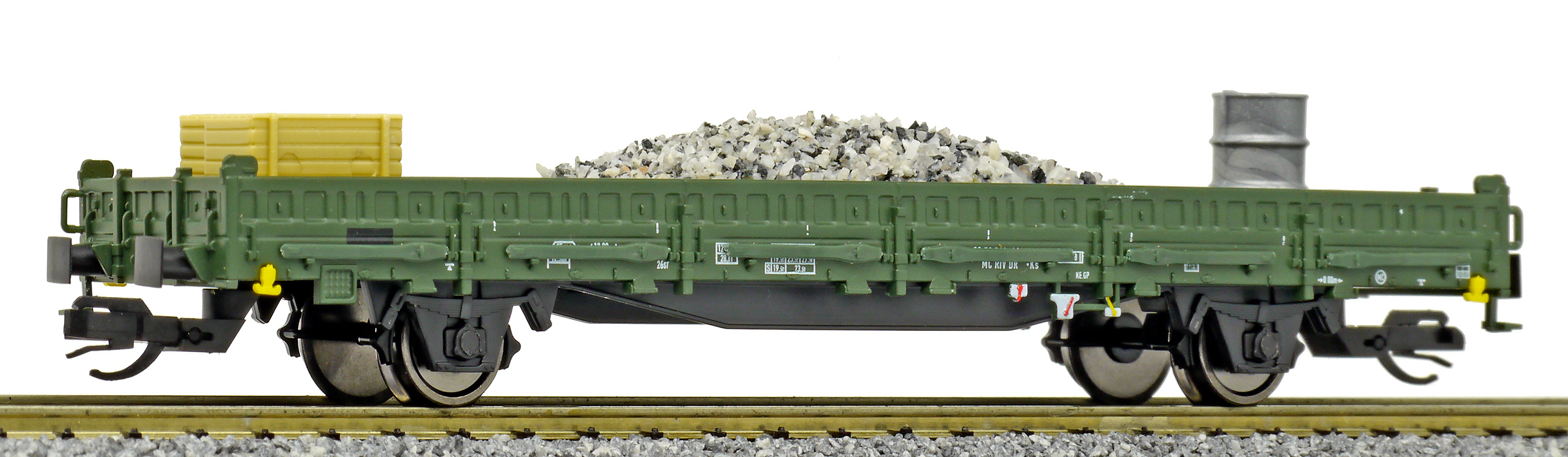 | nízkostěnný nákladní vůz zelený do pracovního vlaku s nákladem pracovního materiálu |