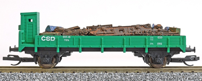 | nízkostěnný nákladní vůz zelený s brzdařskou budkou a nákladem šrotu do pracovního vlaku |