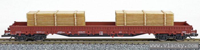 | nízkostěnný nákladní vůz červenohnědý s nákladem dvou balíků prken |