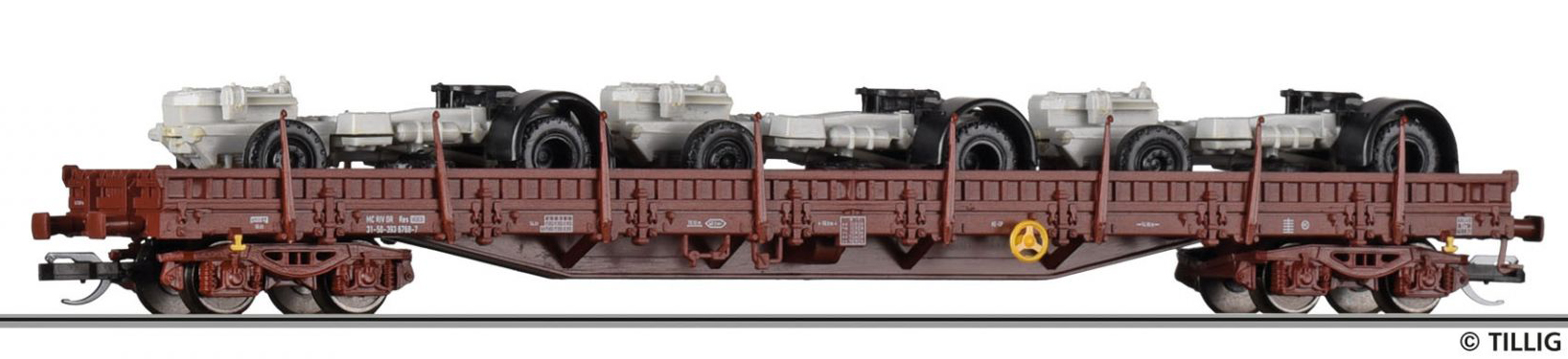 | nízkostěnný nákladní vůz červenohnědý ložený třemi LKW pojezdy |
