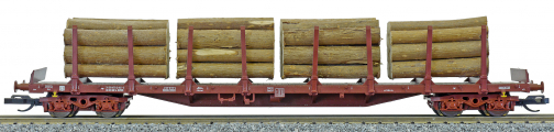 | nákladní plošinový vůz červenohnědý s nákladem kulatiny |