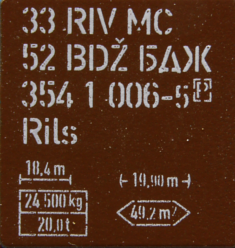 | • 33 52 354 1 006-5 | → | nákladní, s podvozky, pevný rozchod, soukromý vůz, RIV, PPV |
