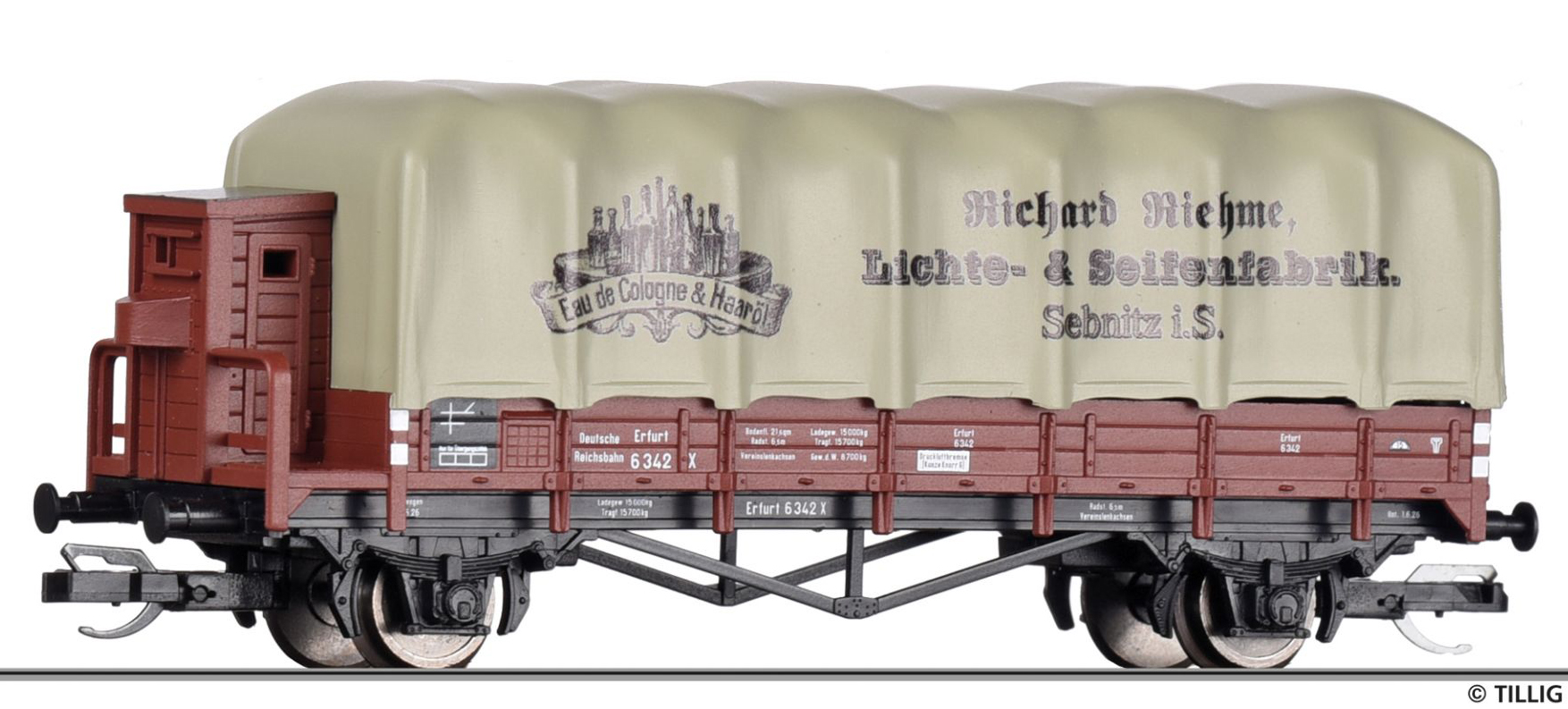 | nízkostěnný nákladní vůz s plachtou „Seifenfabrik Riehme“ |