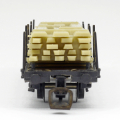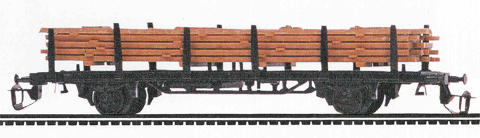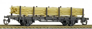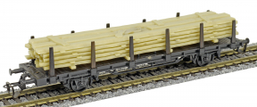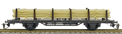 nákladní plošinový vůz černý s klanicemi a s nákladem dřeva