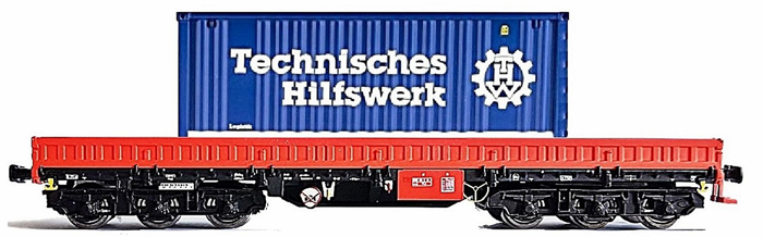 Kód   NW52401   ze SETu   [Nákladní vozy] → [Nízkostěnné] → [6-osé nízkostěnné] → NW52401: nízkostěnných nákladní vůz červenohnědý s kontejnerem „Technisches Hilfswerk”