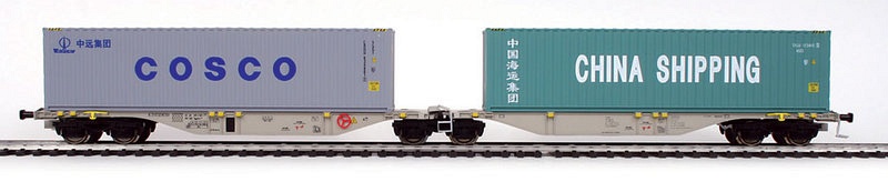 Kód   18063  [Nákladní vozy] → [Nízkostěnné] → [6-osé Kombiwaggon] → 18063: dvoudílný kontejnerový vůz se dvěma kontejnery 40′