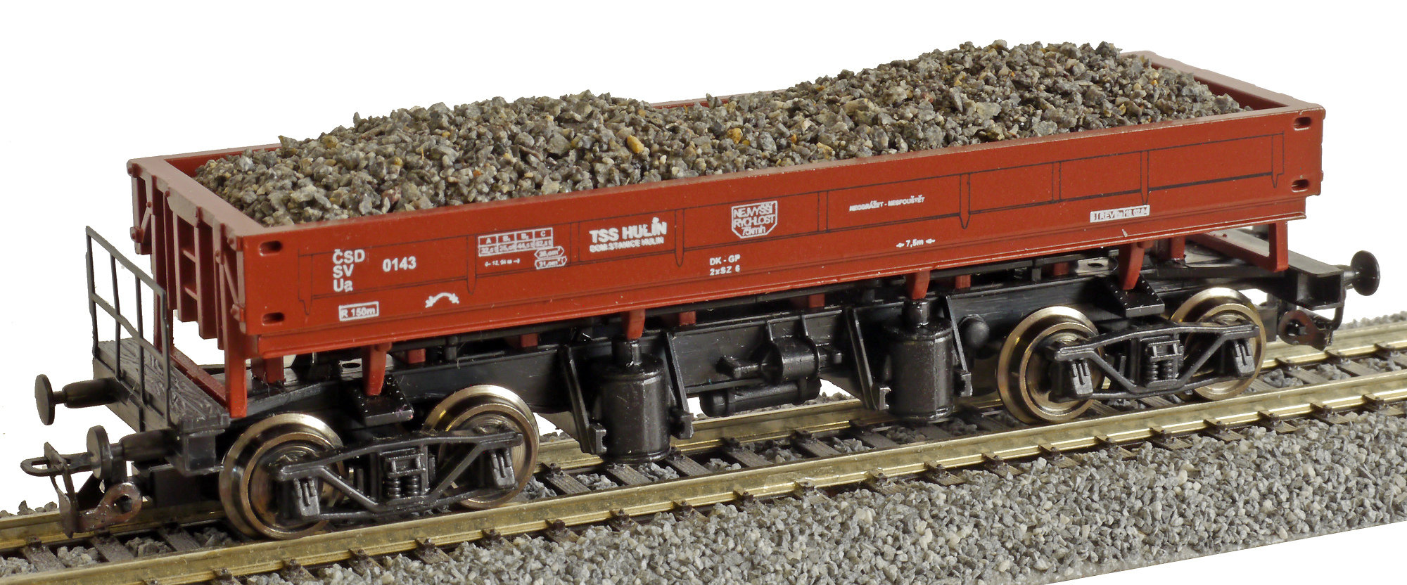nákladní vůz oboustranně výsypný červený s černým pojezdem a nákladem