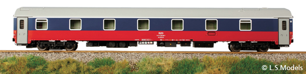 | lůžkový vůz modrý-červený se světlešedou střechou |