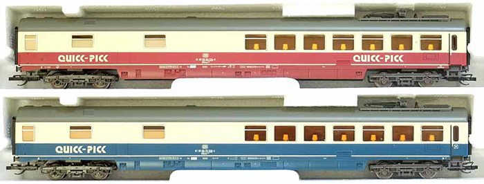 | modrý-slonová kost, šedá střecha s pantografem, jídelní vůz „QuickPick“ |
