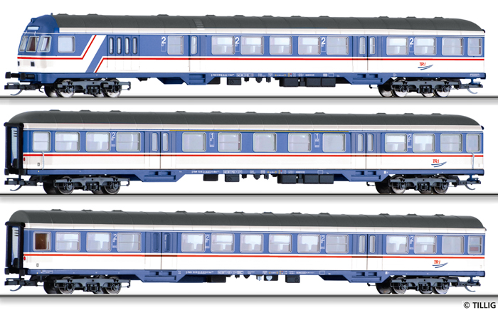 | rychlíkový vůz v barevném schematu „TRI Train Rental International GbR“ 2. tř. |