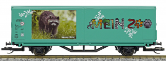 | krytý nákladní vůz s posuvnými stěnami a s reklamním potiskem „Mein Zoo” |