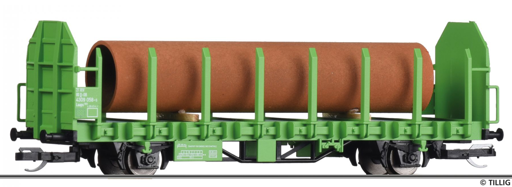 | nákladní nízkostěnný vůz zelený s klanicemi ložený rourou |