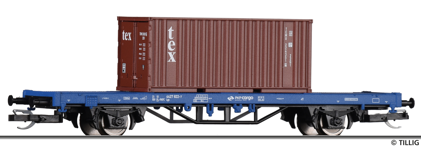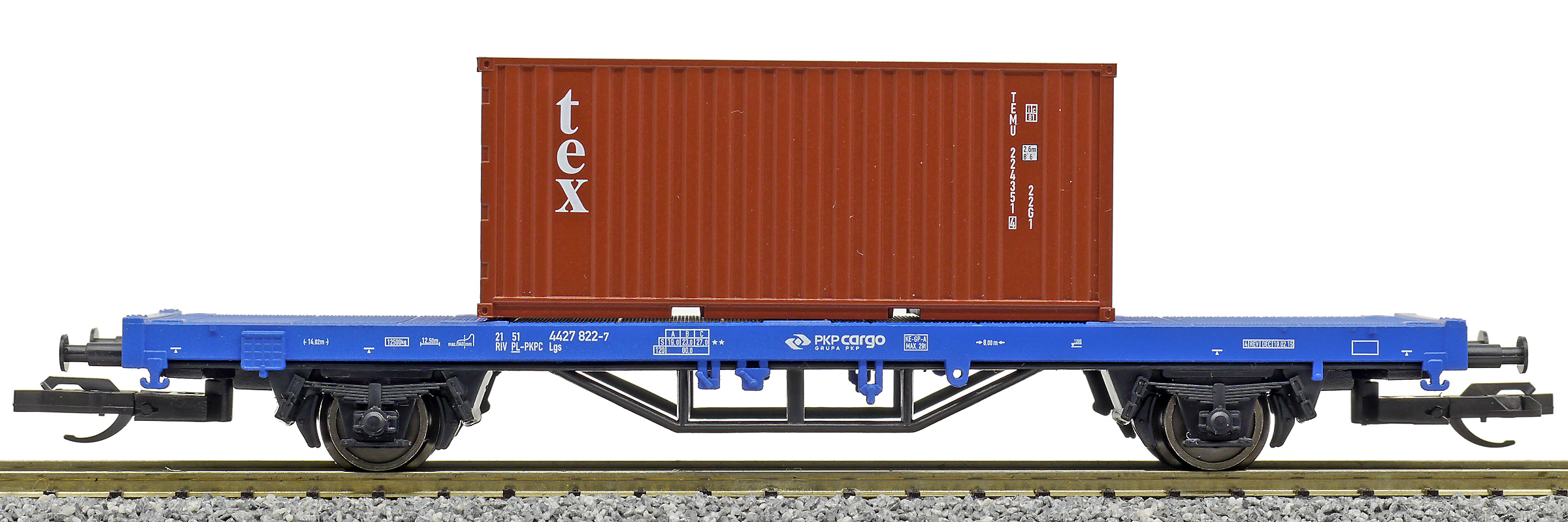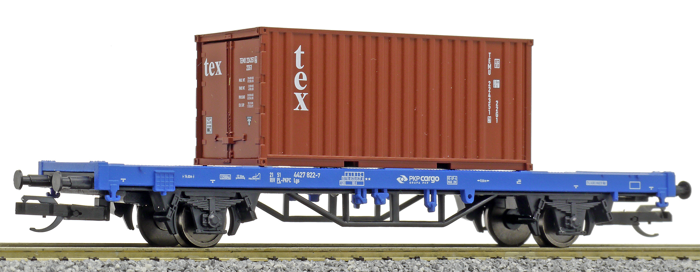 | plošinový vůz modrý s nákladem 1x 20' kontejneru „tex“ |